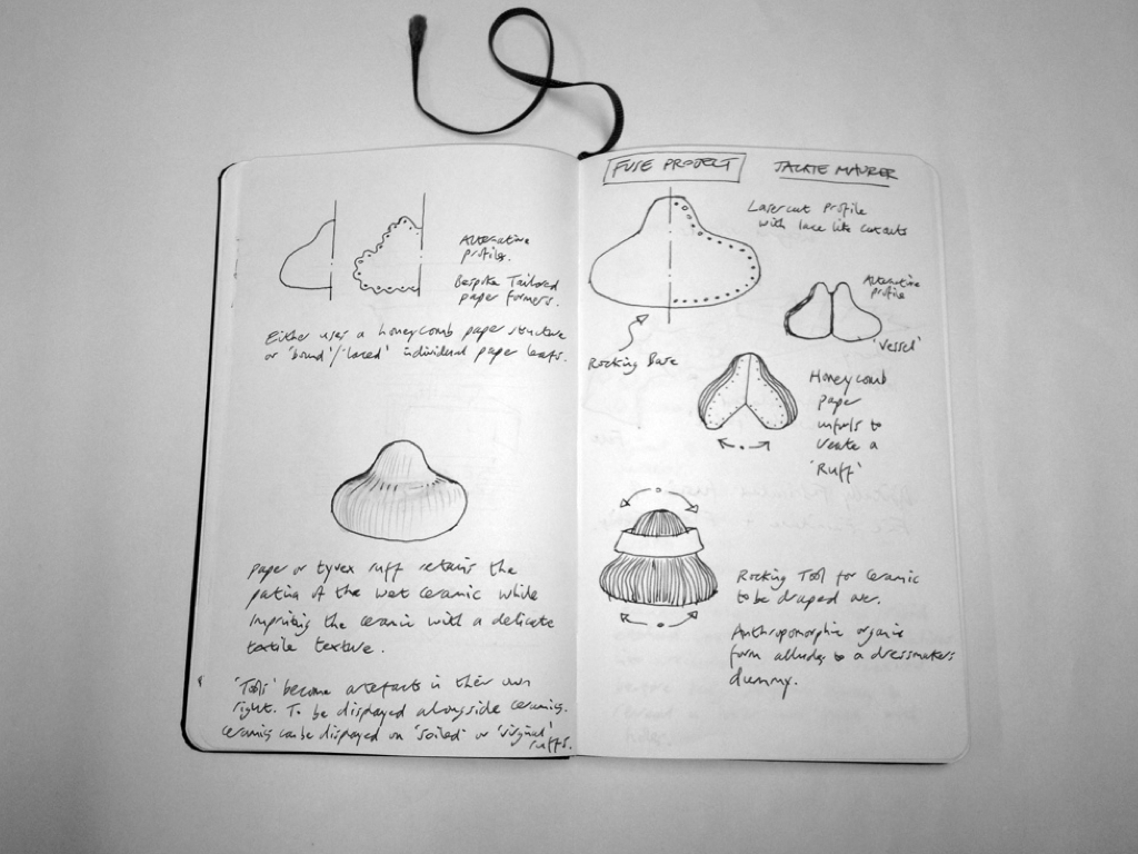 The proposed ‘tools’ become artefacts in their own right, to be displayed alongside the finished ceramics, drawing attention to the art of the designer makers. Alternatively the Ceramic neckpieces can be displayed on ’soiled’ or ‘virginal’ ruffs.