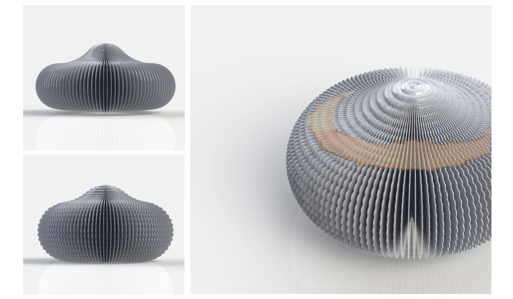 The runner’s central section will be a laser etched rigid cherry veneer featuring a number of integral functional vessels. The runner then transforms at either end into a laser cut articulated wooden and leather fractal fabric before dematerialising further to reveal a laser cut felt base.