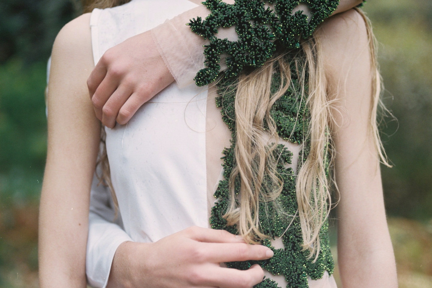 Inspired by communes and cults of 1970s, pagan white, cotton robes expressing simplicity. Intensive hand beading in high relief conveys self reliance. Utilising differing white cottons in varying weights create a flat, organic aesthetic.